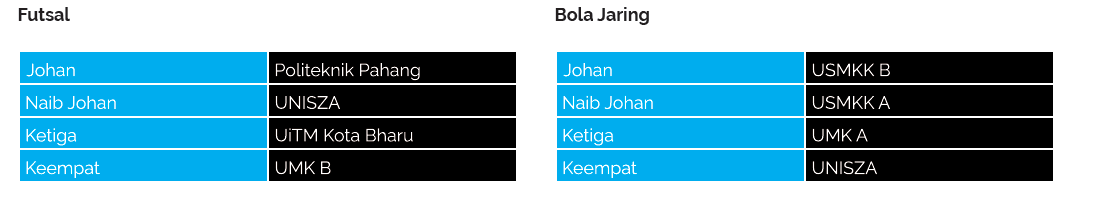 Bagi saingan acara Futsal, UMK telah berjaya mendapat tempat keempat dan bagi acara Bola Jaring pula UMK telah menduduki tempat ketiga. Majlis Penutup dan Penyampaian hadiah disampaikan oleh Encik Mohammad Nizamuddin bin Abdul Rahim, Pengarah Pusat Ko-Kurikulum UMK.